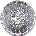 Thomas Shingles' design features the French fleur-de-lis, the Irish shamrock, the Scottish thistle, and the English rose. It commemorates the 100th anniversary of the Charlottetown and Quebec City meetings that led to Confederation.