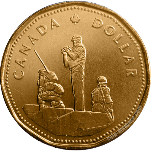 This coin commemorates the 50th anniversary of the United Nations, and pays tribute to the Canadians who have served as UN peacekeepers. It features an image of the Peacekeeping Monument in Ottawa.