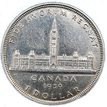 This design by Emanuel Hahn commemorates the visit of His Majesty King George VI and Her Majesty Queen Elizabeth to Ottawa. The Latin phrase Fide Quorum Regnat means He reigns by the faith of his people.