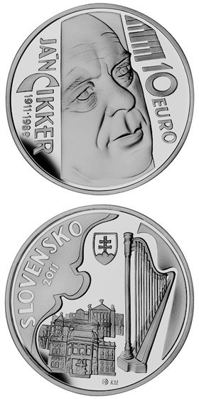 The reverse design features a portrait of Ján Cikker together with part of a piano keyboard in the upper right part. Below it there is the denomination 10 EURO. The name JÁN CIKKER and the years of his birth and death 1911 – 1989 appear on the left side of the coin.