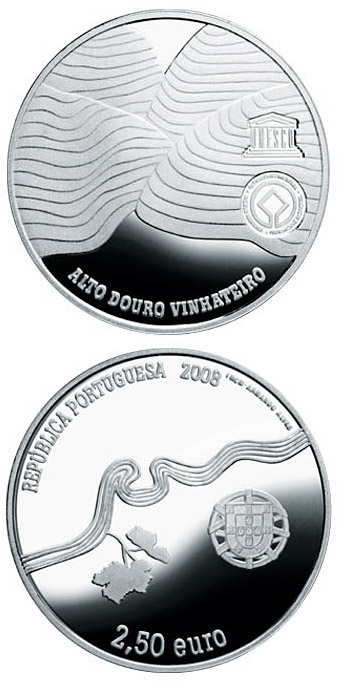 Brainchild of sculptor Armando Alves, the coin presents on the obverse an element that suggests at the same time the flowing river Douro and/ or a vine-plant with two hanging leaves bearing the coat of arms of the Republic and the denomination. The reverse shows the river and the sequence of mountains with their typical terraces, the legend “Alto Douro Vinhateiro”, a reference to the winegrowing Upper Douro, and the Unesco World Heritage logo.
