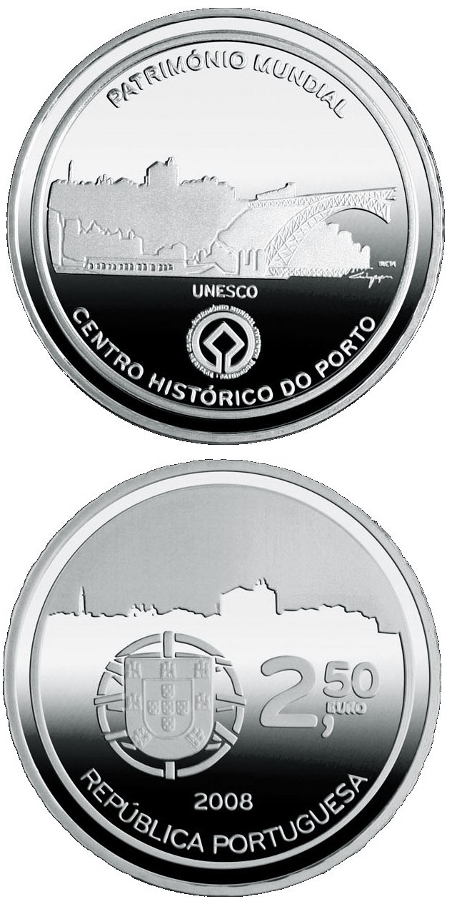 The Historical Centre of Oporto is the city’s oldest part, the urban mesh marked by its medieval origins, declared Cultural World Heritage in 1996. By minting the collector coin devoted to the historical centre of Oporto, a design of sculptor Carlos Marques, IINCM proceeds with the series on the UNESCO World Heritage Sites in Portugal. On the obverse, the coin presents the city’s skyline, the denomination, the coat of arms, the date and the inscription “República Portuguesa”. The reverse puts on view an image and profile of Oporto as seen from the Gaia quays on the left bank of river Douro, the legend «Centro Histórico do Porto» referring to the city’s historic centre and the Unesco World Heritage logo.