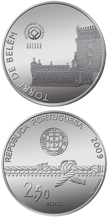 The coin, designed by sculptor José João de Brito, shows in its obverse a composition consisting of the Portuguese Shield and the face value, which is clasped by the strong knot that the Tower displays on its north facing elevation. A relief alluding to the “Torre de Belém”, highlighting the sentry posts that are unique features of the Portuguese military architecture, is shown in reverse. The composition is completed by the World Heritage logo and the word UNESCO.