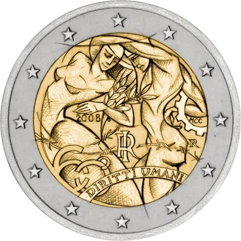 The coin depicts a man and a woman with an olive branch, an ear of corn, a cogwheel and some barbed wire – symbols of the right to peace, food, work and freedom respectively. The monogram of the Italian Republic ‘RI’ is placed between the two figures, as is the year of issue ‘2008’. At the bottom of the image are the links of a chain forming the number ‘60’ and the inscription ‘DIRITTI UMANI’ (human rights). The initials ‘MCC’ of the artist Maria Carmela Colaneri and the mint mark ‘R’ are shown on the right. The outer ring of the coin depicts the 12 stars of the European Union.