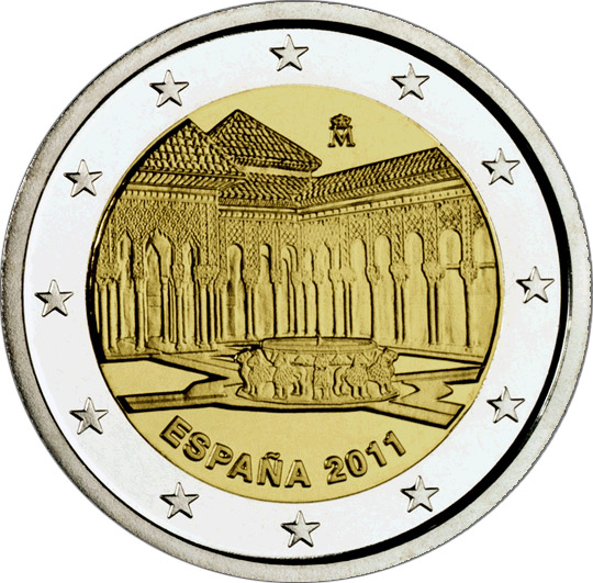 The first half of 2011 saw the release of the fifth issue of the commemorative 2-Euro coin dedicated in this instance to the Alhambra, the Generalife and the Albayzin of Granada. The reverse of this coin depicts the unparalleled Patio de los Leones (Courtyard of the Lions) located in Granada's Alhambra complex. Following the 2010 issue, this is the second coin in the annual series dedicated to sites in Spain that are listed by the UNESCO as World Heritage Sites.