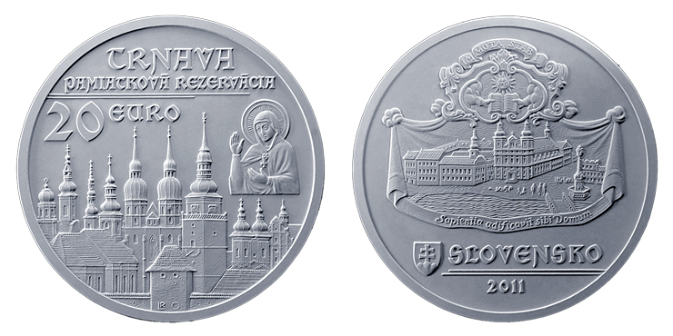The reverse side depicts Trnava's most significant architectural landmarks: the synagogue, the Church of St Anne, the Church of the Assumption of the Blessed Virgin Mary, the Church of St Jacob, the Basilica of St Nicholas, the Town Tower, the Church of the Holy Trinity, the Church of St Joseph, and the fortification tower. To the side of this scene is a depiction of the Virgin Mary of Trnava. In the upper part of the field are two lines of text, reading "TRNAVA PAMIATKOVÁ REZERVÁCIA" (Historical Preservation Area of Trnava), and below them are two horizontal lines and the nominal value of 20 EURO. The stylised initials of the coin's designer, Mgr. art. Roman Lugár and the mark of the Kremnica Mint are set in the steeple outline at the base of the coin.