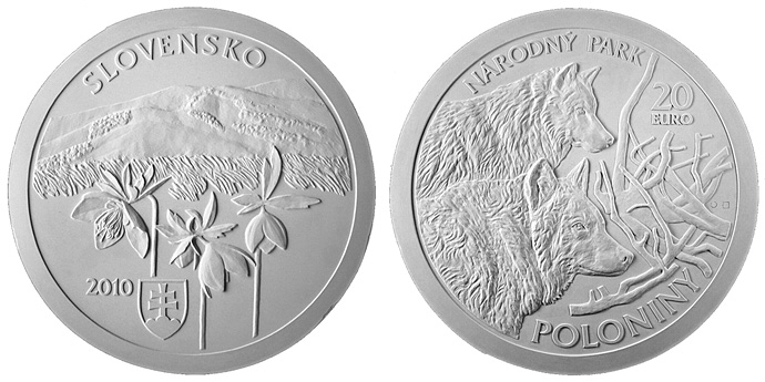 The upper half of the obverse depicts part of the characteristic landscape motif of Poloniny National Park with Purple hellebore underneath. The inscription near the upper rim of the coin reads SLOVENSKO, the name of the country. The lower part shows the national emblem of the Slovak Republic with the year 2010 to its left.