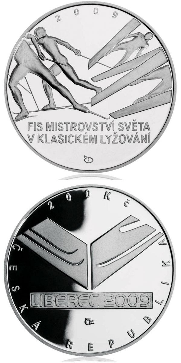On 18 February 2009, the Czech National Bank issues a commemorative silver 200 Kč coin to mark the 2009 FIS Nordic World Ski Championship held in Liberec. The 200 Kč coin is minted from an alloy containing 900 parts silver and 100 parts copper and is issued in two quality versions, normal quality and proof quality, which differ in surface finish and edge marking. Proof quality coins have a highly polished field and a matt relief; the edge is plain with the frieze “CZECH NATIONAL BANK* Ag 0.900 * 13 g *”. Normal quality coins have milled edges. The coin is 31 mm in diameter, weighs 13 g and is 2.3 mm thick. As with any other coins, deviations in diameter of 0.1 mm and thickness of 0.15 mm are allowed. Upward deviations in weight of 0.26 g and silver content of 1% are permitted.