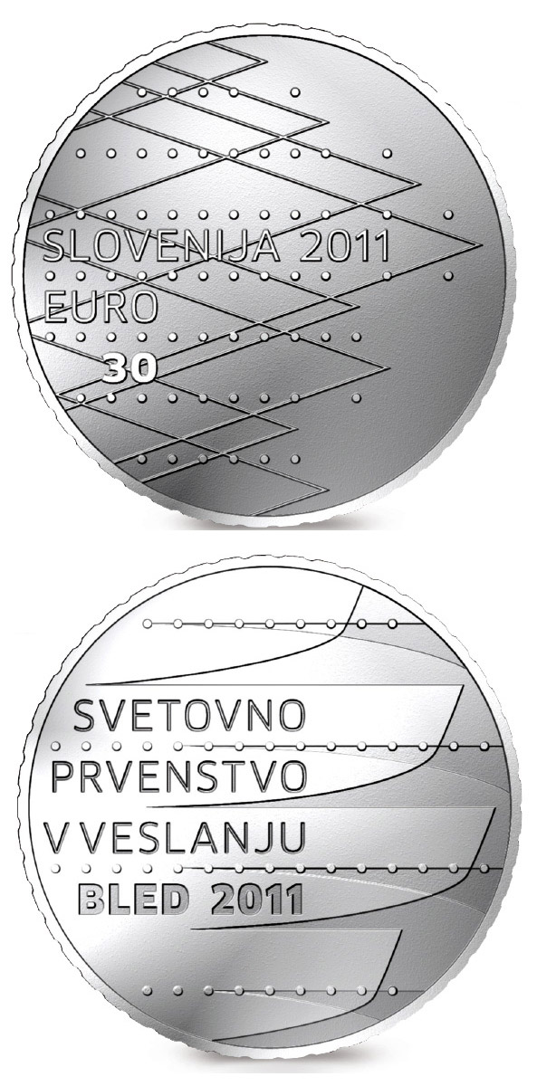 Slovenia has decided to issue collector coins to commemorate the World Rowing Championships in Bled, where the world's best rowers will compete. The obverse of the coins will bear an illustration of the wake of a boat and oars, while the reverse will bear the outlines of boats racing across the water's surface.