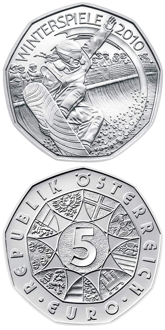 Each coin displays a winter discipline in which Austria is a world-leading performer. The first has as its theme ski jumping. One sees the helmeted ski-jumper captured in his flight from the end of the steep ramp against a background of trees in an alpine forest.