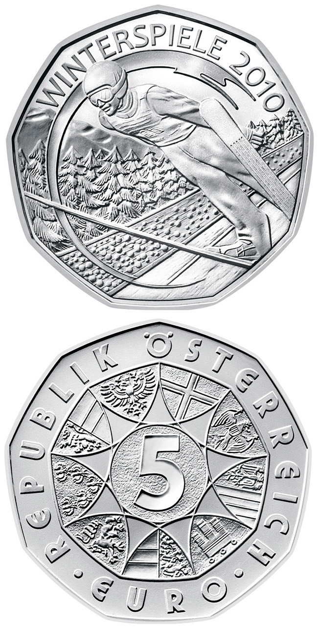 5 euro - Winter Games 2010 SnowboardSeries: Austria - Silver 5 euro coins The second design shows a female snow-boarder as she performs a hair-raising air trick, flipping her snowboard up over the rim of the half-pipe in which they perform.