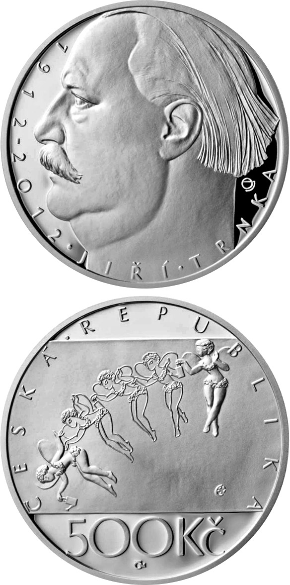 The obverse side of the coin features a rectangle containing a female elf from Jiří Trnka’s film "A Midsummer Night’s Dream" in phased motion. The name of the state “ČESKÁ REPUBLIKA” is located around the left-hand, upper and right-hand edges of the coin. The denomination and abbreviated monetary unit “500 Kč” is below the depiction of the elf. Above the abbreviated monetary unit is the logo of the project “European Silver Programme”, under which the coin is being issued. The logo comprises a star located within the “€” symbol. The mark of the Czech Mint is located at the bottom edge of the coin. The reverse side of the coin features a portrait of Jiří Trnka. Around the outer circle is the unclosed inscription consisting of the years “1912–2012” and the text “JIŘÍ TRNKA”. The coin was designed by Josef Oplištil. His initials, made up of the intertwined letters “OJ”, are to the right of the portrait.
