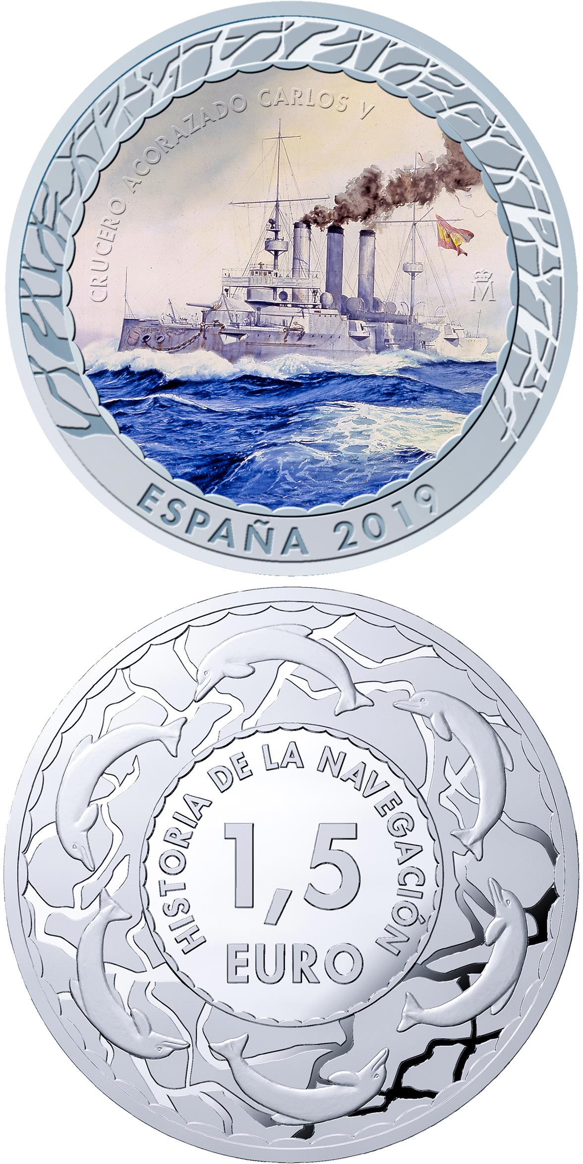 On the obverse is reproduced, in colours, an image of the work entitled "Crucero Carlos V", which is preserved in the Naval Museum of Madrid.