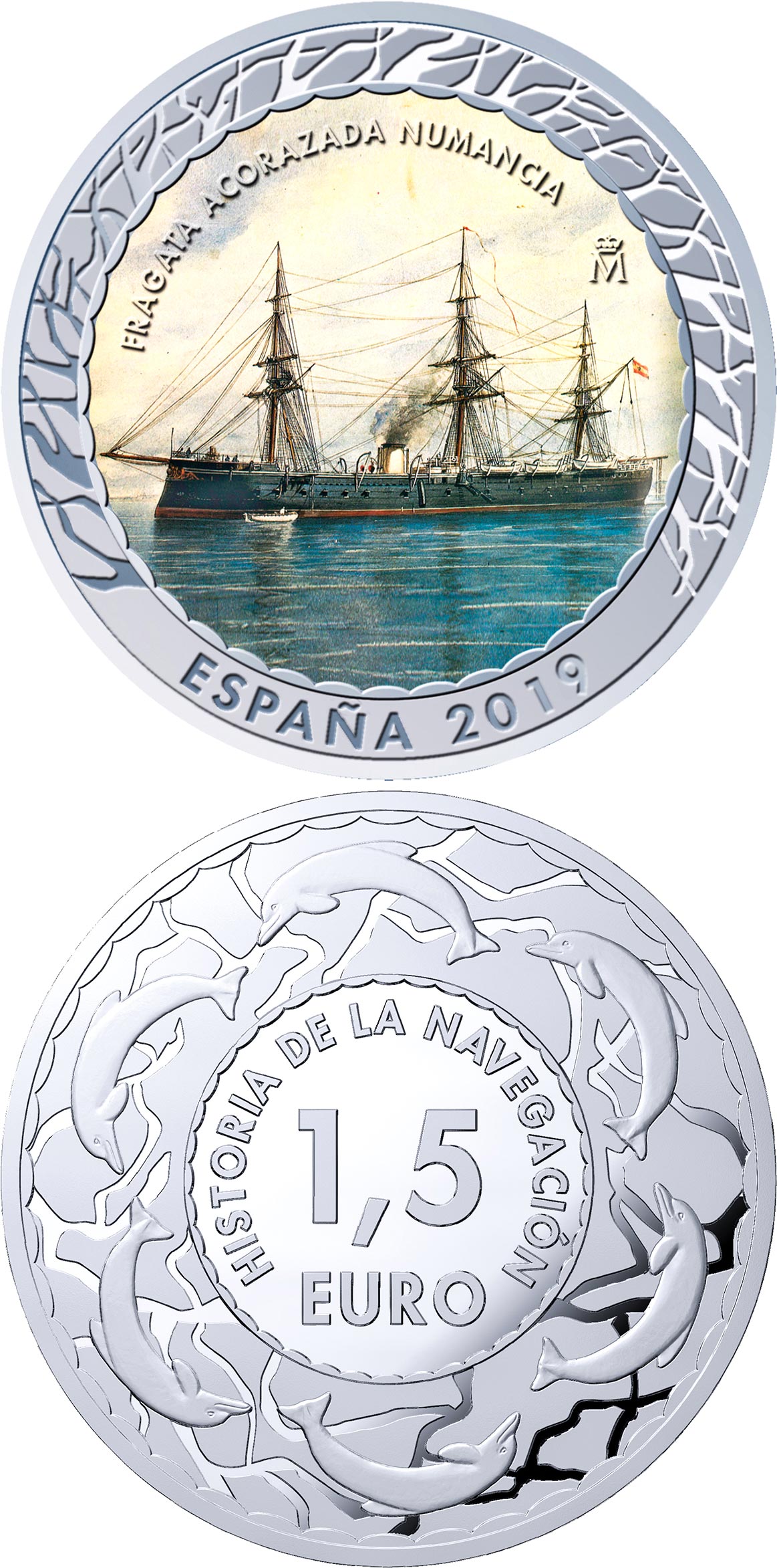 On the obverse, in the central area, an image of the work titled "Modern military navy is reproduced in colors. Battleships. Numancia Spanish frigate, which is preserved in the Naval Museum of Madrid. In the upper left, the legend FRAGATA ACORAZADA NUMANCIA. In the lower part, the legend ESPAÑA and the year of minting 2019.