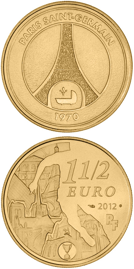 A coin devoted to the famous football club Paris Saint-Germain, founded in 1970, is also struck. In the Premier League since 1974, this club plays at home in the "Parc des Princes" stadium in Paris and is the recipient of numerous cups, the most recent being the Coupe de France in 2010. Based on their European performances, this club ranks third among French teams. On the obverse, the club's emblem is surrounded by the words "Champion de France". The years when they claimed this title are featured underneath. The reverse features the design of a footballer kicking a ball. The UEFA Cup Winners' Cup - which the club won in 1996 - appears inside the ball. In the background stands the Parc des Princes stadium.