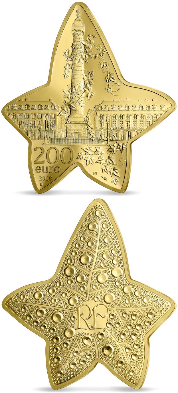 The reverse of this coin shows the Vendôme Place highlighting the famous column embellishing this square. The ivy, symbol of triumphant nature, climbs onto the Vendôme column by wrapping around this one. We can see the face value on the left below of the coin.