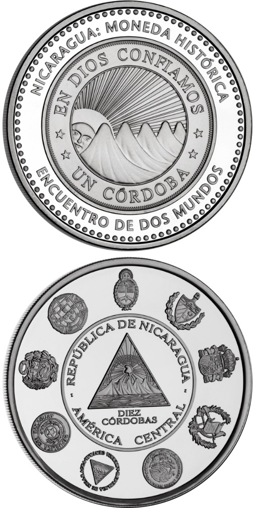 The obverse reproduces the reverse of the first coins minted in the cordoba currency, created in March 1912 to replace the Peso. It shows the face of a rising sun radiating over a range of five volcanoes that represent the five Central American countries. This design has its origin in the metal 1-real coin which was struck in 1824 by the Central American Federation three years after the Central American countries had gained independence from Spain. The center of the reverse side features the arms of Nicaragua. Shown surrounding this central motif, and in alphabetical order clockwise, are the national coats-of-arms of the other countries that are participating in this issue.