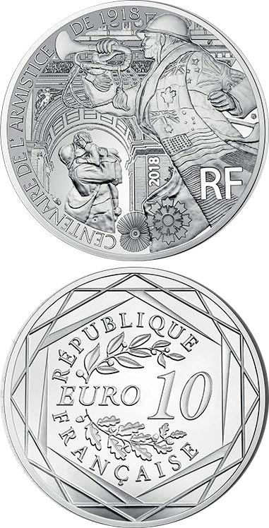 The obverse displays the bugler that called the cease-fire. The soldier wears multiple flags along with a Cornflower and a Poppy. The Arc de Triomphe is in the background, under which a returning soldier holds his child in his arms.