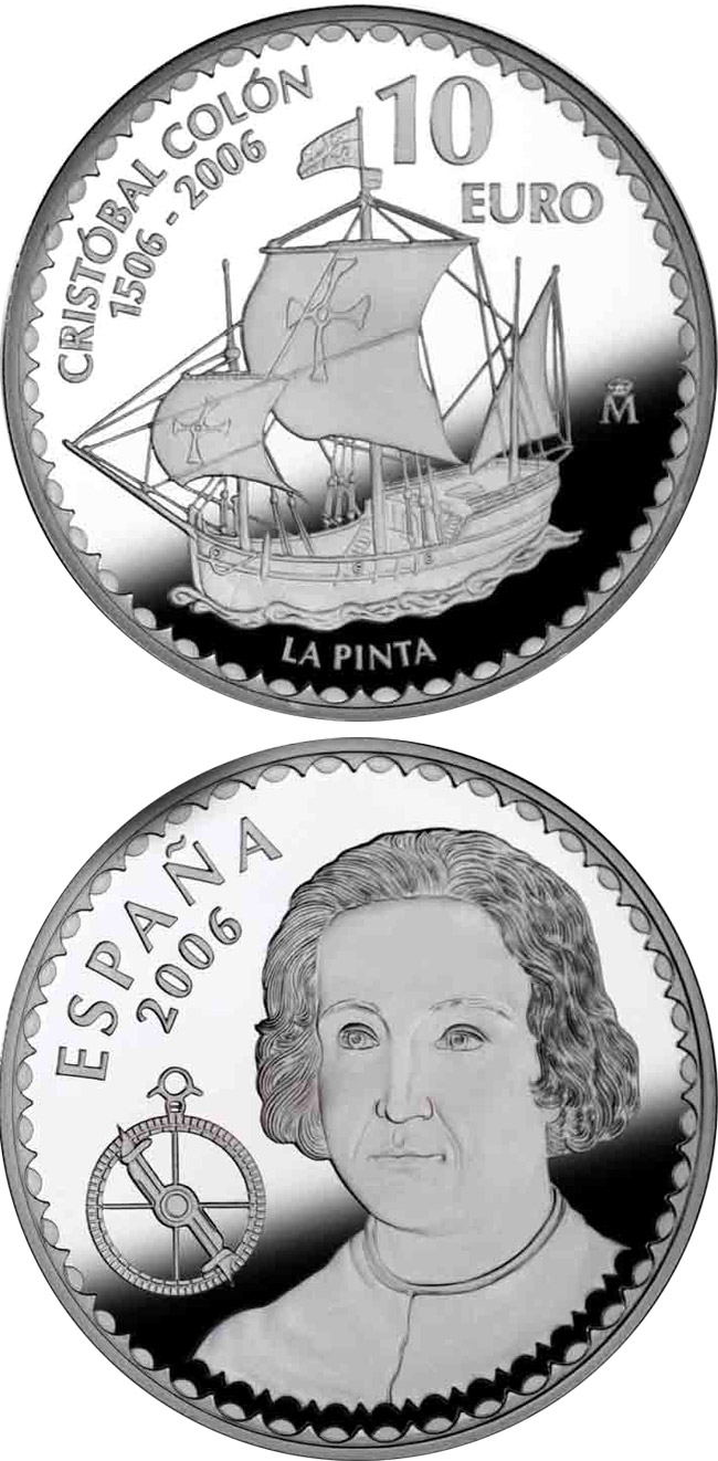 This year we commemorate the Quincentenary of the death of the great seafarer and discoverer Christopher Columbus, who died in Valladolid in 1506. His momentous voyage, in search of an alternative route to the Indies, concluded in the discovery of the New World. To mark the occasion the Spanish Royal Mint has minted a proof quality series of coins dedicated to commemorate this important figure and his great achievement, the discovery of America.The obverse, common for all three 10-Euro coins, portrays a likeness of Christopher Columbus and an astrolabe in the lower portion. The reverse of this second coin illustrates the caravel "The Pinta" which accompanied Columbus on his first voyage to America.
