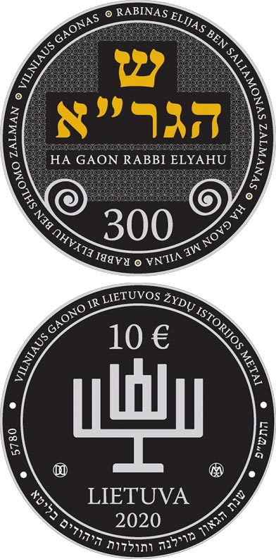 The obverse of the coin bears the sign of Lithuanian Jews (Litvaks) – the community identity symbol representing the identification of Lithuanian Jews, as citizens, with the State of Lithuania since the reign of Gediminas, the Grand Duke of Lithuania; above it – the denomination (€10), below – the inscription LIETUVA (LITHUANIA), the year of issue (2020), the mark of the creative team of the graphic project and the mintmark of the Lithuanian Mint. The main design of the coin is surrounded by the inscription “The Year of the Vilna Gaon and the History of the Jews of Lithuania” in the Lithuanian and Hebrew languages as well as the number 5780 which stands for the year 2020 in the Jewish calendar.