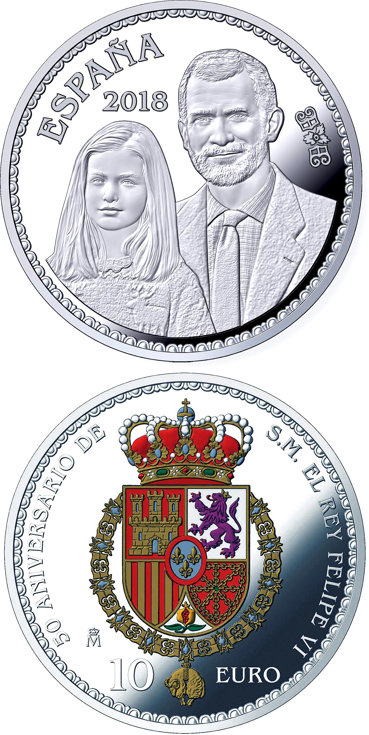 Image of 10 euro coin - 50th Anniversary of H.M. Felipe VI | Spain 2018.  The Silver coin is of Proof quality.