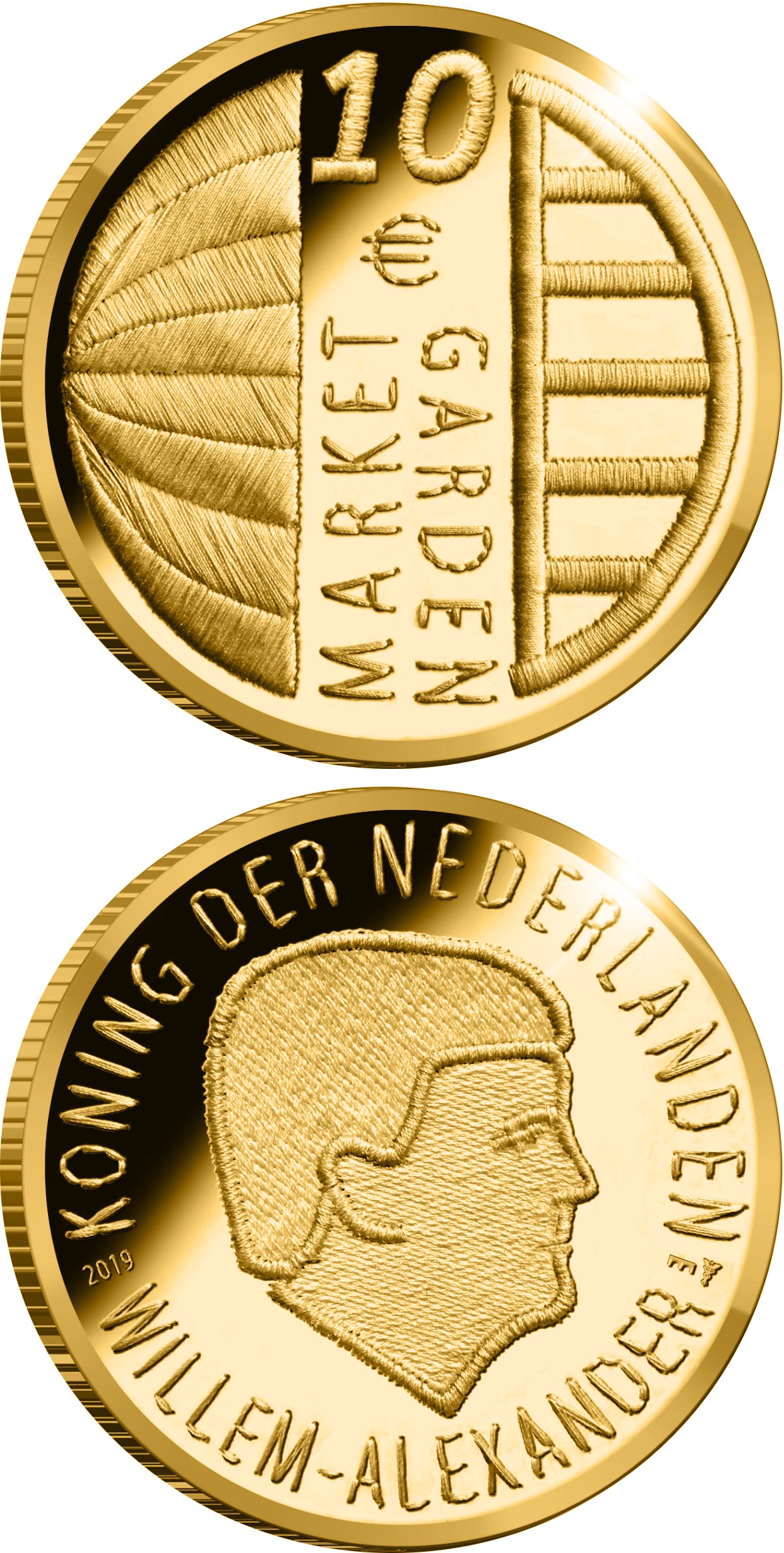 The parachute on the coin depicts the largest airborne operation ever on Dutch territory. Also featured, is the bridge over the Rhine near Arnhem, to give the partial failure of the operation its place on the coin. The Allies failed to capture the bridge over the Rhine near Arnhem.