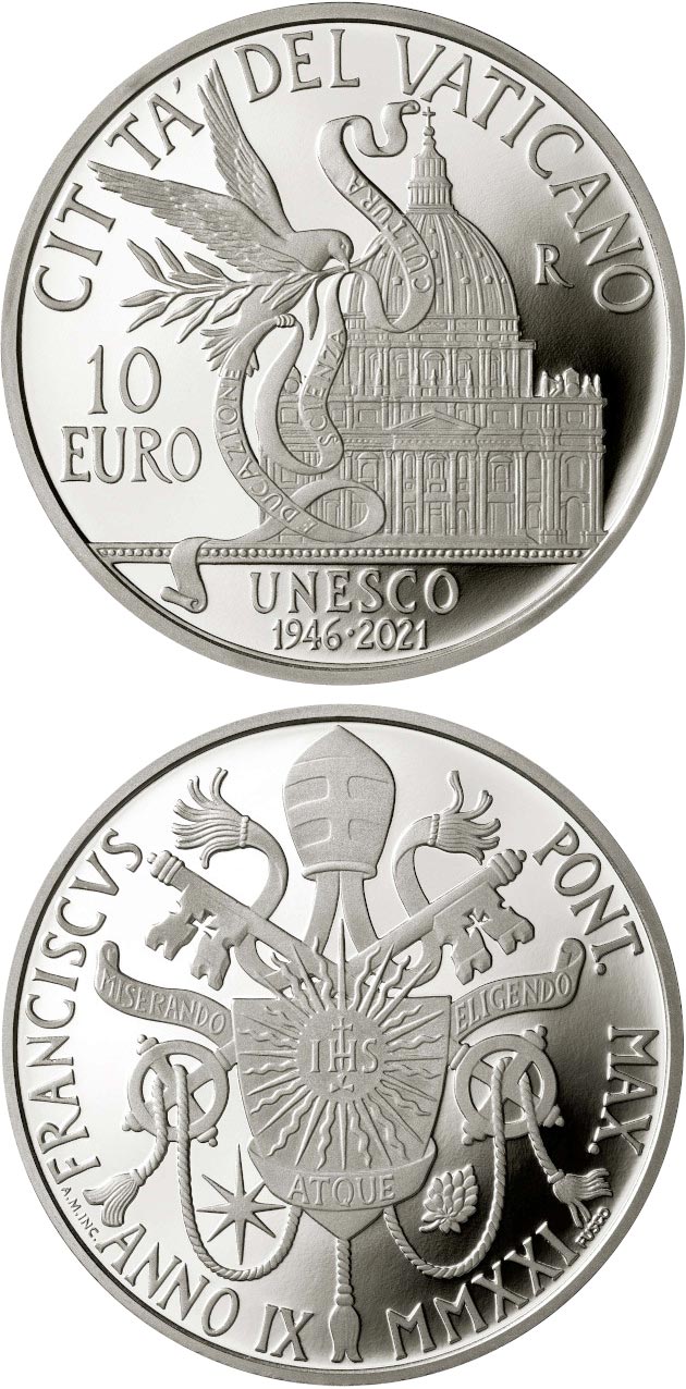 The Vatican Mint is issuing a 10 euro silver coin to mark the 75th anniversary of the founding of UNESCO. The organization was founded in 1945 at the end of World War II in order to ensure lasting peace. UNESCO stands for “United Nations Educational, Scientific and Cultural Organization.” In the coin design artist Daniela Fusco features a dove with an olive branch in its beak (symbol of peace) and a ribbon on which are written three words symbolizing the commitment against any kind of war and discrimination: education-science-culture. On the right Saint Peter’s Basilica is depicted as a symbol of Christianity. Vatican City in its entirety was declared a World Heritage Site in 1984.