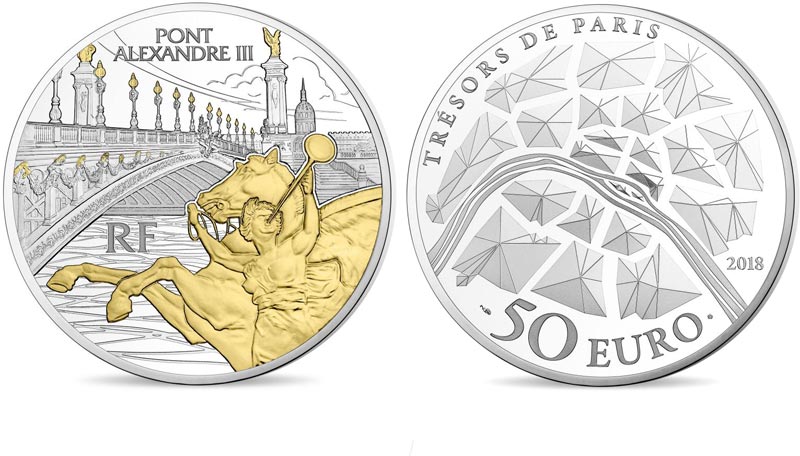 The obverse portrays the Alexander III bridge crossing the Seine as seen from the right bank. In the foreground an enlarged view of a Fame accompagnied by Pegagus.