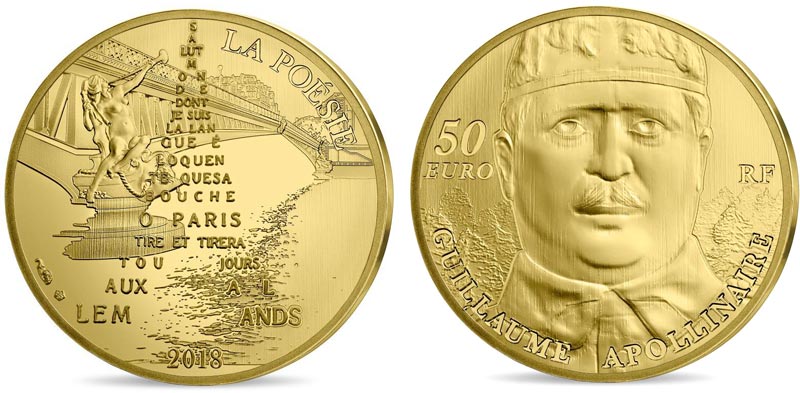 The obverse of the coin shows the calligram of Guillaume Apollinaire speaking about the Eiffel Tower. In the background, a landscape inspired by one of his famous poems, Pont Mirabeau, is represented.