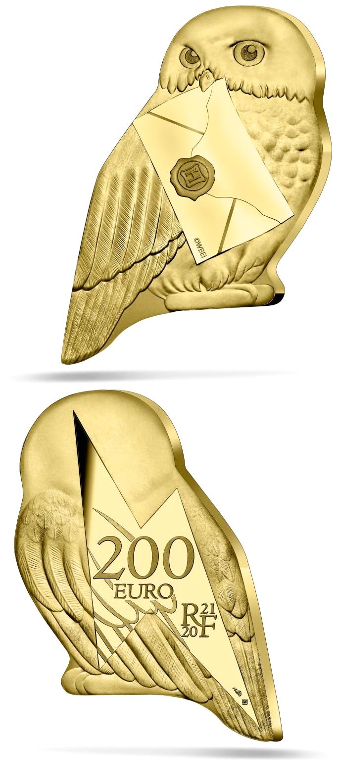 This originally shaped coin pays homage to Hedwige, theowl that Hagrid gave to Harry Potter for his 11th birthday bought in Diagon Alley. Hedwig holds in its beak the acceptance letter from Hogwarts School of Witchcraft and Wizardry, received by every wizard on his 11th birthday.