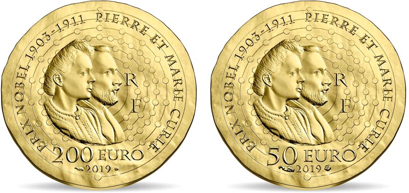 The reverse represents in the center, the couple formed by Marie Curie and her husband Pierre. They are surrounded by the evocation of the Nobel Prizes she has received; one with her husband in 1903, the second, on her own, in 1911.