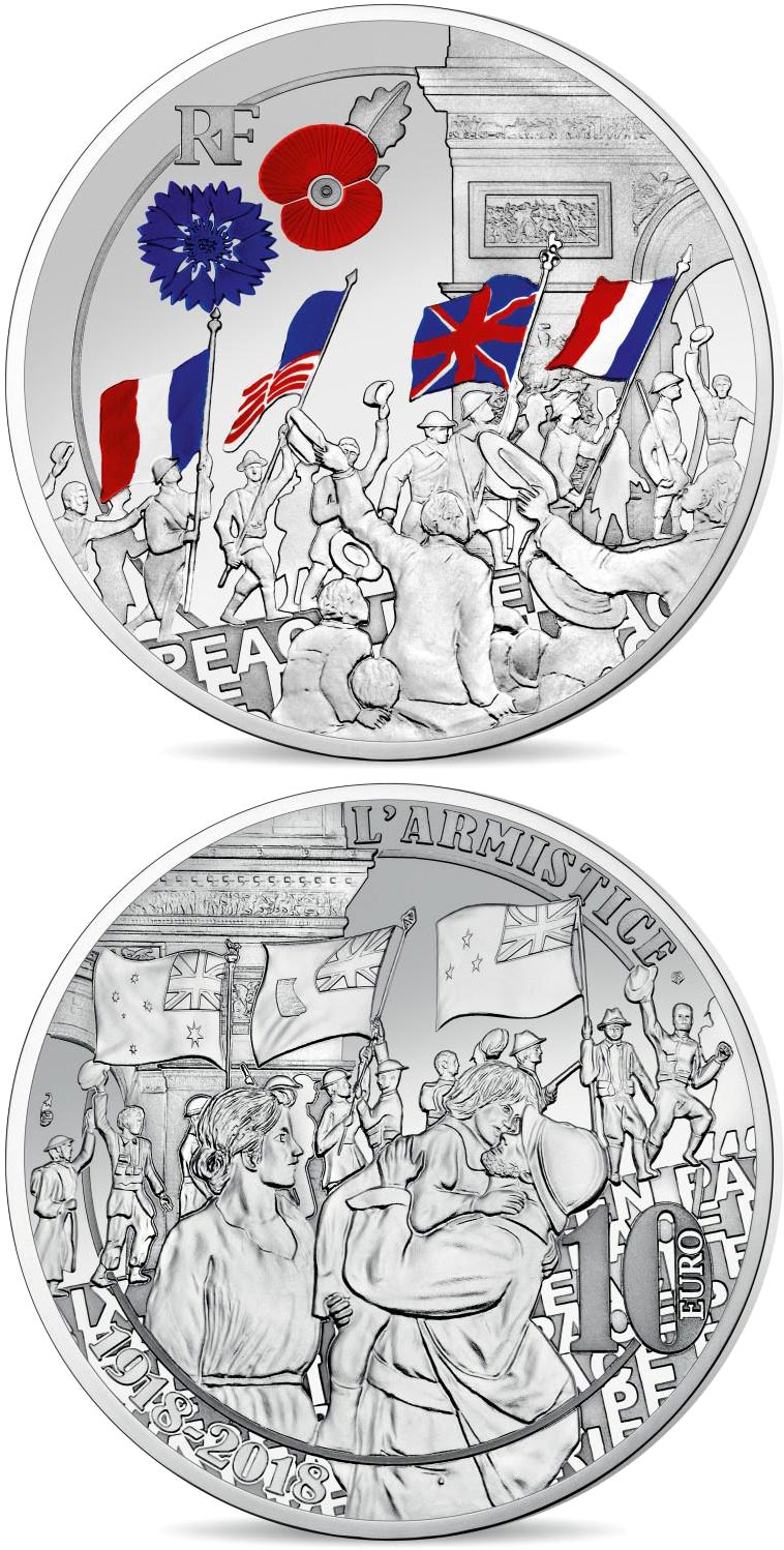 The obverse shows the peoples’ jubilation; families are welcoming the soldiers from all nations. The French, British and American flags are displayed; these flags as well as the Poppy and Cornflower are coloured on the silver version. In the background stands the Arc de Triomphe…