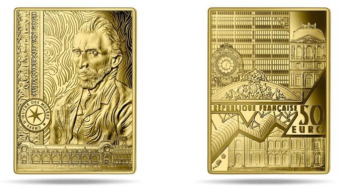 The obverse of the coin shows a major part of the art work. The Van Gogh portrait is in close-up and appears on the right side of the coin. The below border of the painting features a view of the facade of Orsay Museum seem from the Seine, where the art work is kept. The title of the art work and the name of the artist are inscribed on the left part of the frame. The stamp « Chefs d’œuvre des Musées » has been added below the inscriptions on the left. The 2020 yeardate is visible below on the right of the artist’s portrait The reverse is common to the series, it shows a mix of some French museums views.