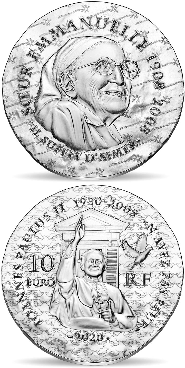 The obverse represents the portrait of Sister Emmanuelle The hammered surface in he background represents shooting stars and echoes religion and belief.