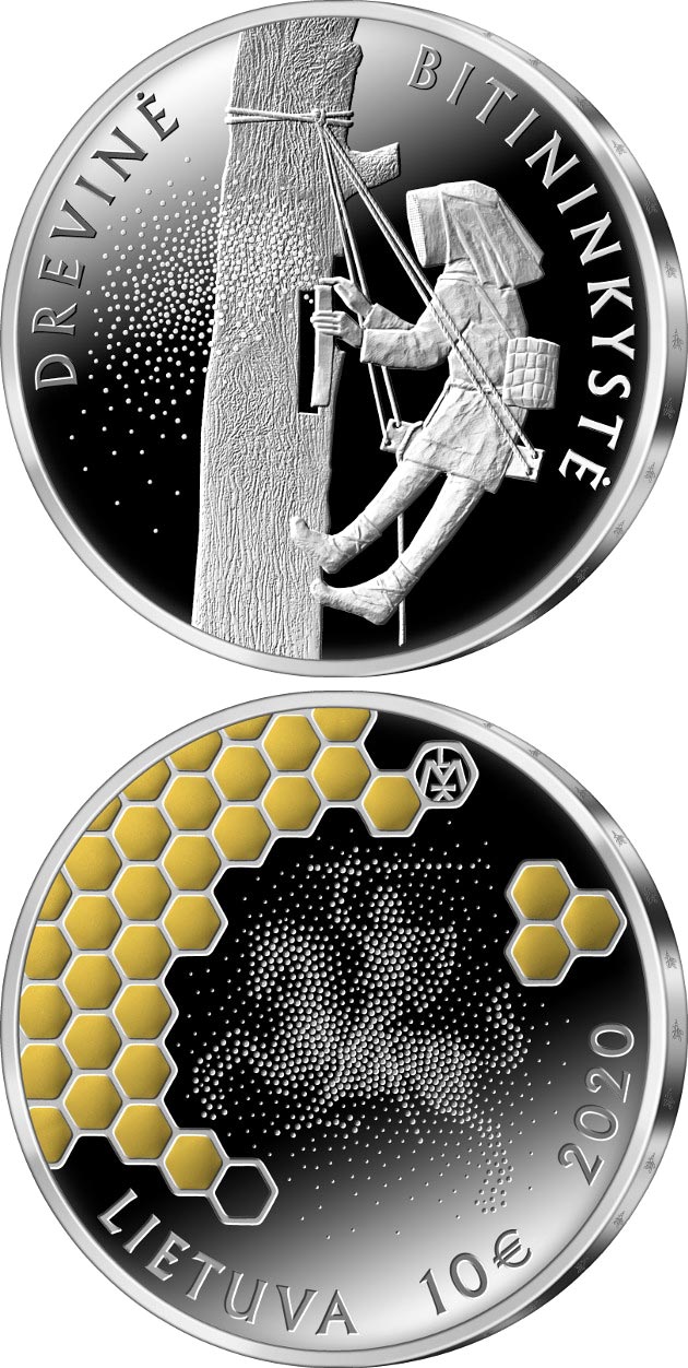 The obverse of the coin features a stylised Vytis, the coat of arms of the Republic of Lithuania, formed as if from a swarm of bees and a honeycomb full of honey. The honeycomb was foregrounded using a pad-printing technology. It also bears the inscription LIETUVA (LITHUANIA), the year of issue (2020), denomination (€10) and the mintmark of the Lithuanian Mint. The reverse of the coin depicts an old Lithuanian beekeeping tradition of harvesting honey from tree hollows: having climbed in to a tree, a beekeeper, his head shielded with a beekeeping veil, is harvesting honey next to a swarm of bees. It also bears the inscription DREVINĖ BITININKYSTĖ (TREE BEEKEEPING).