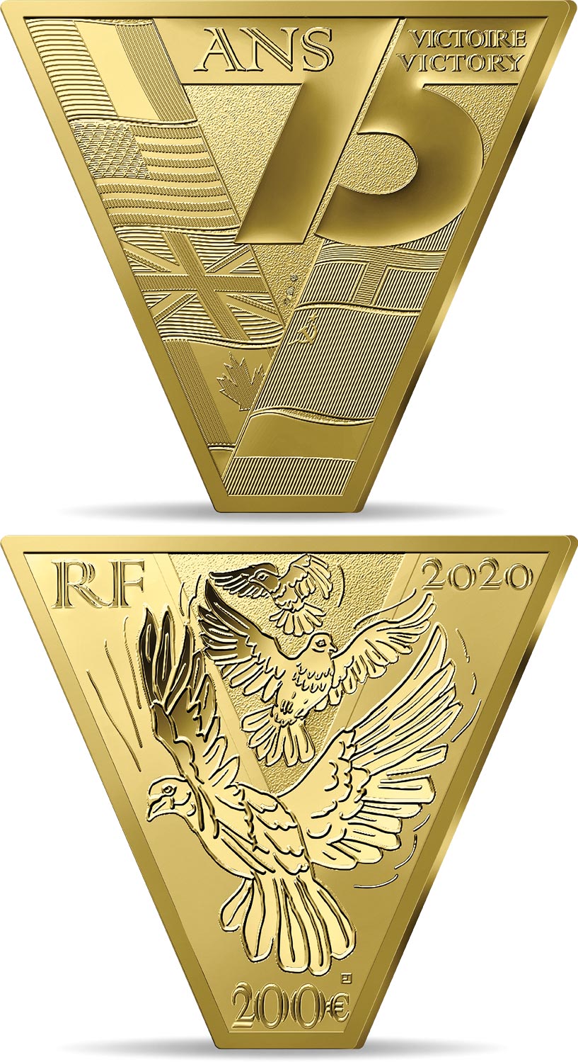 On the obverse of the coin are the flags of the allied nations of the Second World War. These flags bear the heraldic codes for colours. The inscription "75 ans Victoire - Victory" appears on theright and refers to the anniversary of the Allied victory over Nazi Germany. The coin is in the shape of a trapeze bearing a V made up of flags symbolizing Victory, an innovation for Monnaie de Paris.