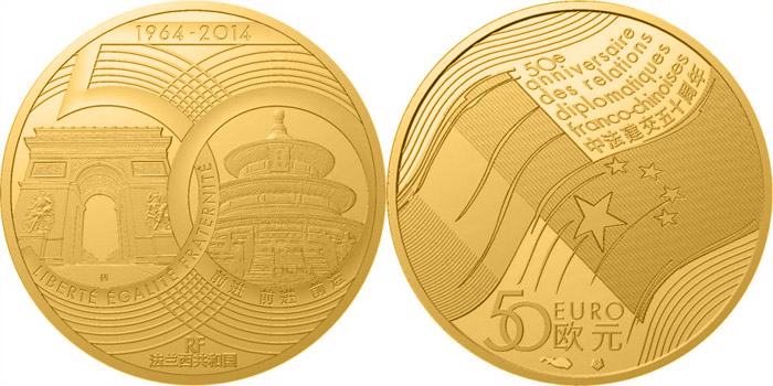 10 euro - France-China : 50years of Diplomatic Relations Coupure : 1/4 oz Auteur : Monnaie de Paris Poids : 8,45 g Diamètre : 22 mm Tirage : 888 Métal : Or 920/1000 Qualité : Belle Epreuve Millesime : 2014 Valeur Faciale : 50 €