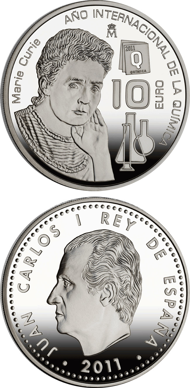 The reverse of the coin features a likeness of Marie Curie, ceded by the Curie Museum (coll. ACJC) in Paris. At left, the lettering Marie Curie. At right, AÑO INTERNACIONAL DE LA QUÍMICA. Below this, the mint mark, the logotype in Spanish of the International Year of Chemistry, the text 10 EURO (the face value of the coin), and a portrayal of some laboratory vessels. The obverse portrays the likeness of His Majesty King Juan Carlos.
