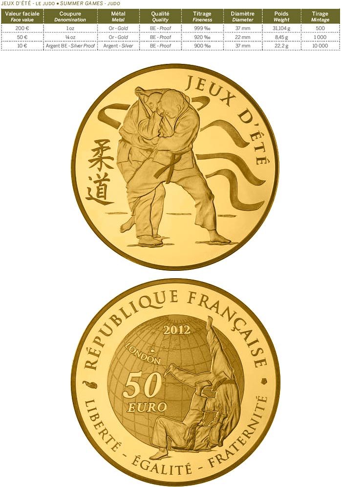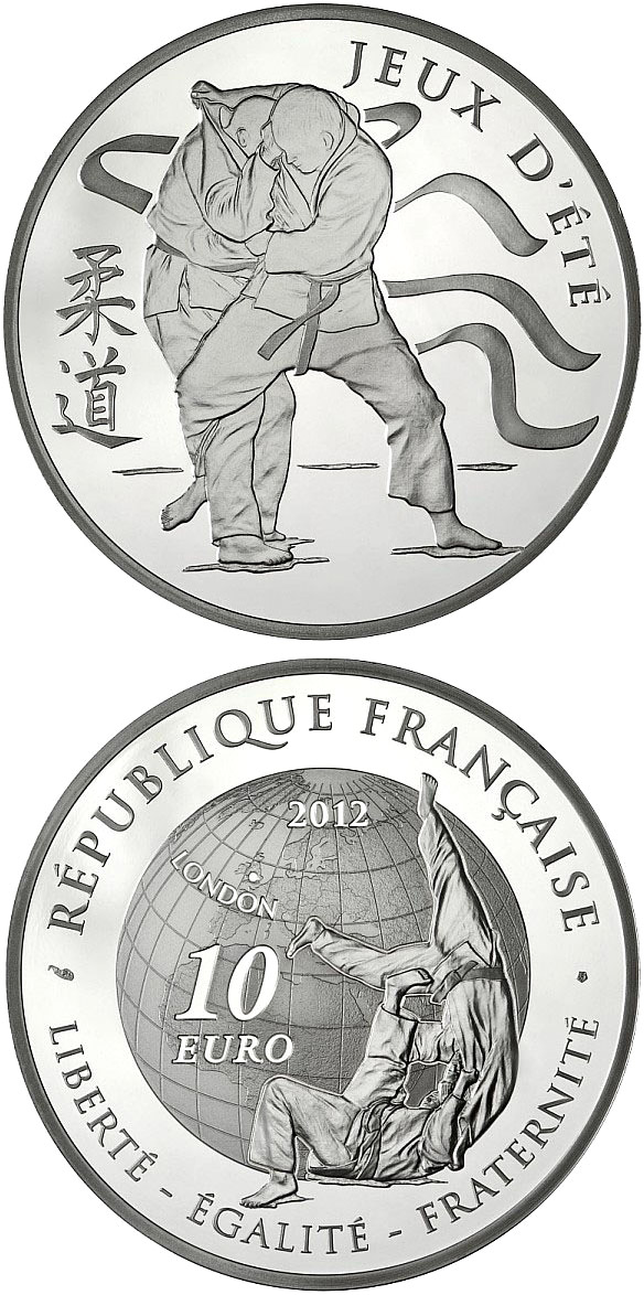 With the 2012 Summer Olympic Games taking place in London, Monnaie de Paris is celebrating judo as part of the Summer Games and Winter Games series. Judo became an Olympic sport for men in 1964 (Tokyo Olympics) and for women in 1992 (Barcelona Olympics). This coin is an opportunity for Monnaie de Paris to pay tribute to the French judokas, who are second only to Japan, as an Olympic medal-winning team. The judo move "O soto Gari" - a much-used technique to off-balance opponents and a throw required for belt exams - is a symbol of this sport and features in the background of the obverse. On the left side, the ideogram for judo comprises 2 designs: "flexibility" and "path". On the reverse is the judo move "Tomoe Nage", which is a throwing technique. A globe highlighting London is centred in the background of the coin.