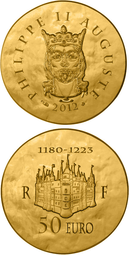 Philippe II Auguste (1165-1223) achieved major military victories which reaffirmed his royal power and brought the Feudal era to an end. He constructed the Louvre in order to demonstrate his resolve to make Paris the capital. On the obverse, Philippe II Auguste is depicted wearing one of the first crowns to bear the royal fleur de lys. The King's name appears along the edge of the coin. The reverse features the Louvre in Philippe II Auguste's time. The dates of his reign (1180-1223) also appear at the top of the coin.