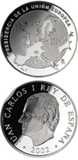 To commemorate Spain’s Presidency of the European Union during the first semester of 2002, a coin was issued in proof quality bearing a design making reference to this event. Obverse and reverse 8-reale silver Spain´s presidency of the European UnionMinted from silver in proof quality and given a face value of 10 Euros, the coin commemorating Spain's Presidency of the E.U. shows the profile of H.M. King Juan Carlos I on the obverse and the map of the countries that comprise the European Union on the reverse.