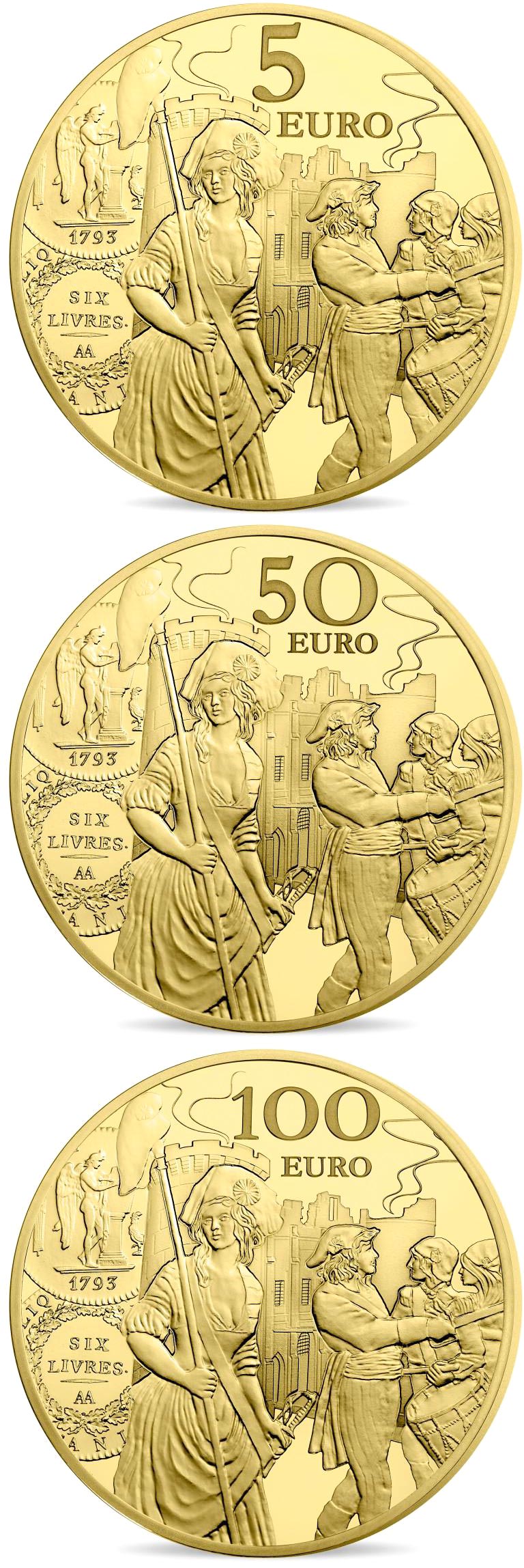 The reverse of this 100€ Gold coin presents the revolutionary era with some of its major symbols : the storming of the Bastille in 1789, the National Guard and the revolutionaries with their phrygian cap or their characteristic hat.