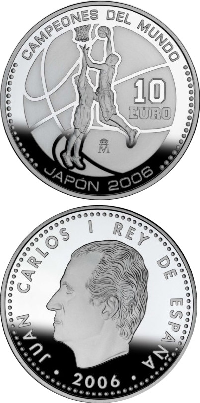 The Spanish Basketball Team had its biggest all-time success with the award of a gold medal at the 15th World Basketball Championships held in Japan during the summer of 2006. The Spanish Royal Mint, desiring to join in the celebration of this record Spanish victory, has minted two collector coins featuring basketball-related themes. Obverse and reverse 8-reales silver. World Basketball Champions - Japan 2006The obverse features His Majesty King Juan Carlos. On the reverse, over the drawing of a ball, a scene is shown of two basketball players in which one of them attempts to dunk the ball and the other tries to stop him.