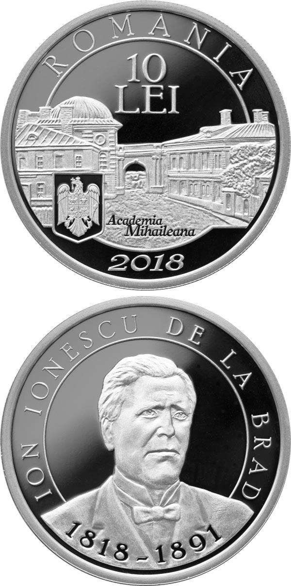 Obverse: a vintage image of Academia Mihăileană (Michaelian Academy) where Ion Ionescu de la Brad was the first professor of agricultural sciences in the history of Romanian education, the inscription “ROMANIA” in an arc, the face value “10 LEI”, the coat of arms of Romania and the year of issue “2018”.