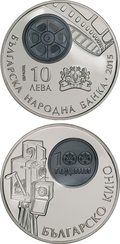 The obverse of the coin, within an embedded medallion, features a film spool unwinding through the medallion. Underneath are: the nominal value ‘10 ЛЕВА’ (10 levs) and the BNB logo with the year ‘1879’ on the strip. ‘БЪЛГАРСКА НАРОДНА БАНКА’ (Bulgarian National Bank) and the year of issue ‘2015’ are inscribed in circumference.