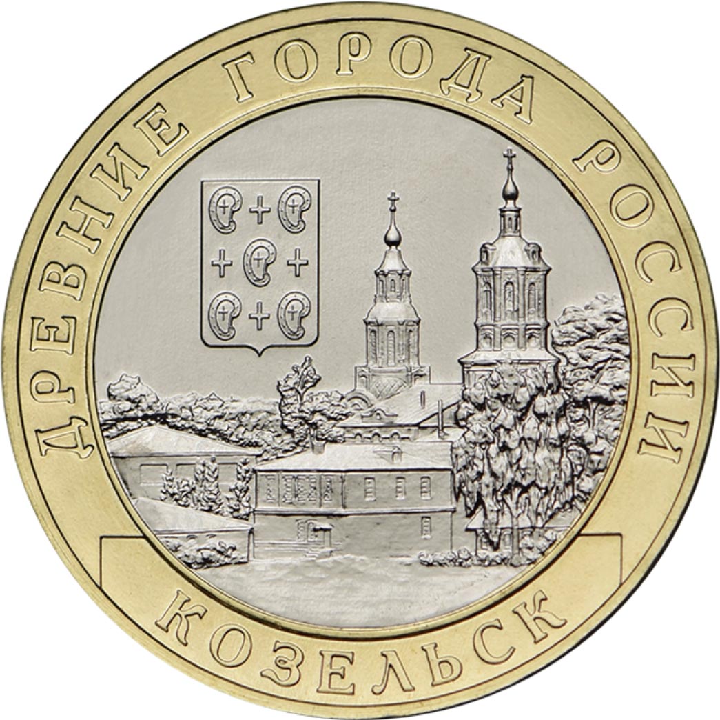 The reverse of the coin (Catalogue No. 5714-0069) features a view of the Nikolskaya Church, an image of the municipal arms of Kozelsk at the upper left, and the inscriptions on the outer ring: ‘ДРЕВНИЕ ГОРОДА РОССИИ’ (ANCIENT TOWNS OF RUSSIA) along the upper circumference and ‘КОЗЕЛЬСК’ (KOZELSK) along the lower circumference.