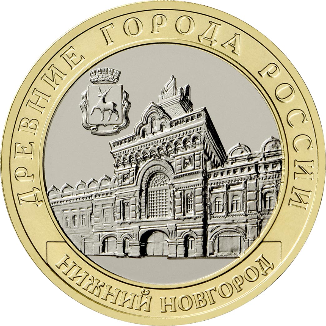 a relief image of the building of the Nizhny Novgorod trade fair; the emblem of Nizhny Novgorod at the top on the left; and the inscriptions on the outer ring along the rim: ‘ДРЕВНИЕ ГОРОДА РОССИИ’ (ANCIENT TOWNS OF RUSSIA) at the top and ‘НИЖНИЙ НОВГОРОД’ (NIZHNY NOVGOROD) at the bottom.