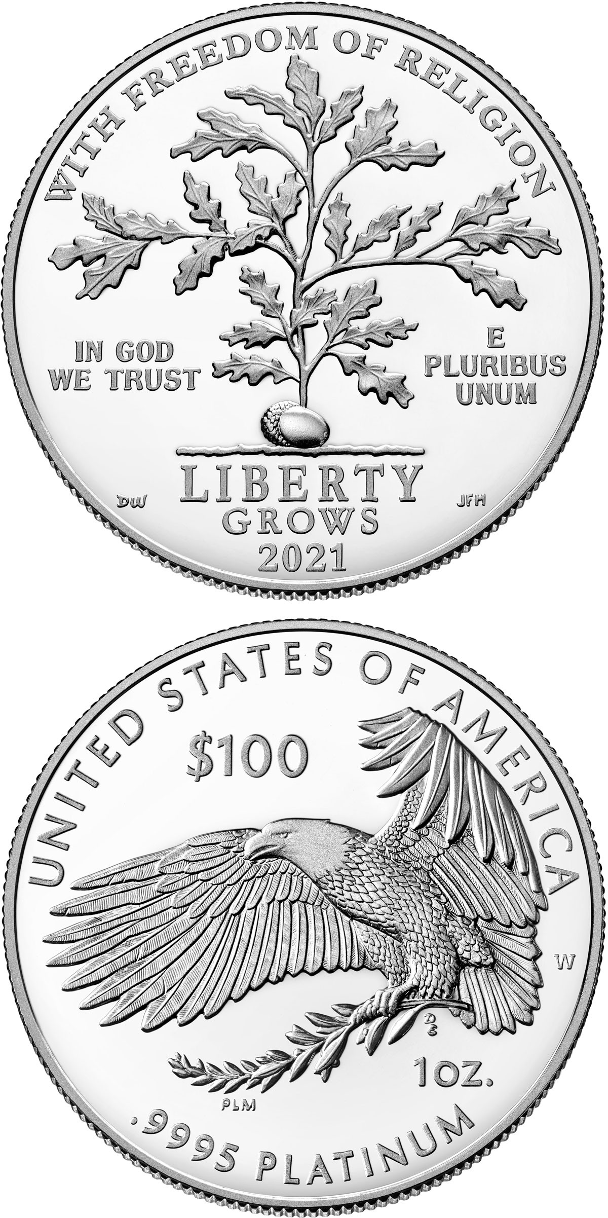 The United States Mint (Mint) announced today that it is launching a new five-year Platinum Proof Coin Program series starting in 2021 and continuing through 2025. This new five-year series is part of the program legislated by the 104th Congress in 1996. The new series features all new obverse (heads) designs, as well as a new common reverse (tails) design on a one ounce, 99.95 percent platinum proof coin each year. The designs are available here.