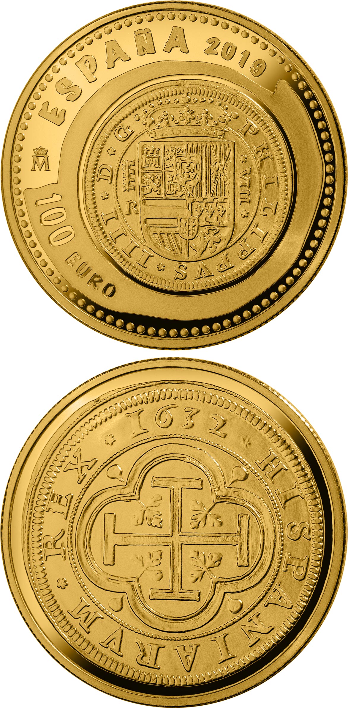 On the obverse, in the centre of the coin and within a circle, the obverse of a piece of eight Escudos by Philip IV, minted in 1632, is reproduced. Outside the central circle, the data referring to this collector coin appear: on the left, the mint mark and, above it, in an ascending circular direction and in capital letters, the legend SPAIN 2019; below the mint mark, in a descending circular direction and in capital letters, the value of the piece, 100 EURO. A pearl milling surrounds all motifs and legends.