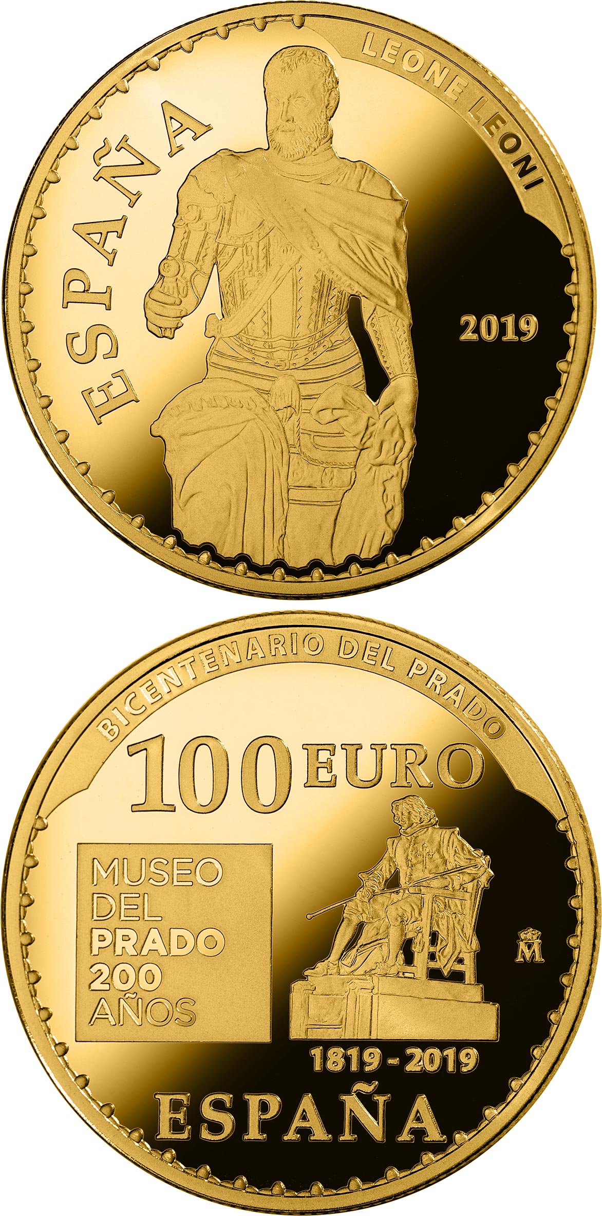 On the obverse, a fragment of the sculptural work entitled "Carlos V", made by Leone Leoni around 1553, which is preserved in the Museo Nacional del Prado, Madrid, is reproduced. On the left, the legend SPAIN; on the right, the year of minting 2019. On the upper right side appears the legend LEONE LEONI.